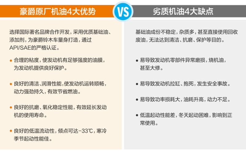 豪爵原廠機油是豪爵與世界領先的潤滑油品牌合作,針對豪爵鈴木發動機 “量身定做”的專用機油,除了通過基本的API/SAE國際標準測試外,還必須通過豪爵獨自開發的多項嚴苛測試,因此能發揮出豪爵鈴木發動機的優異性能。